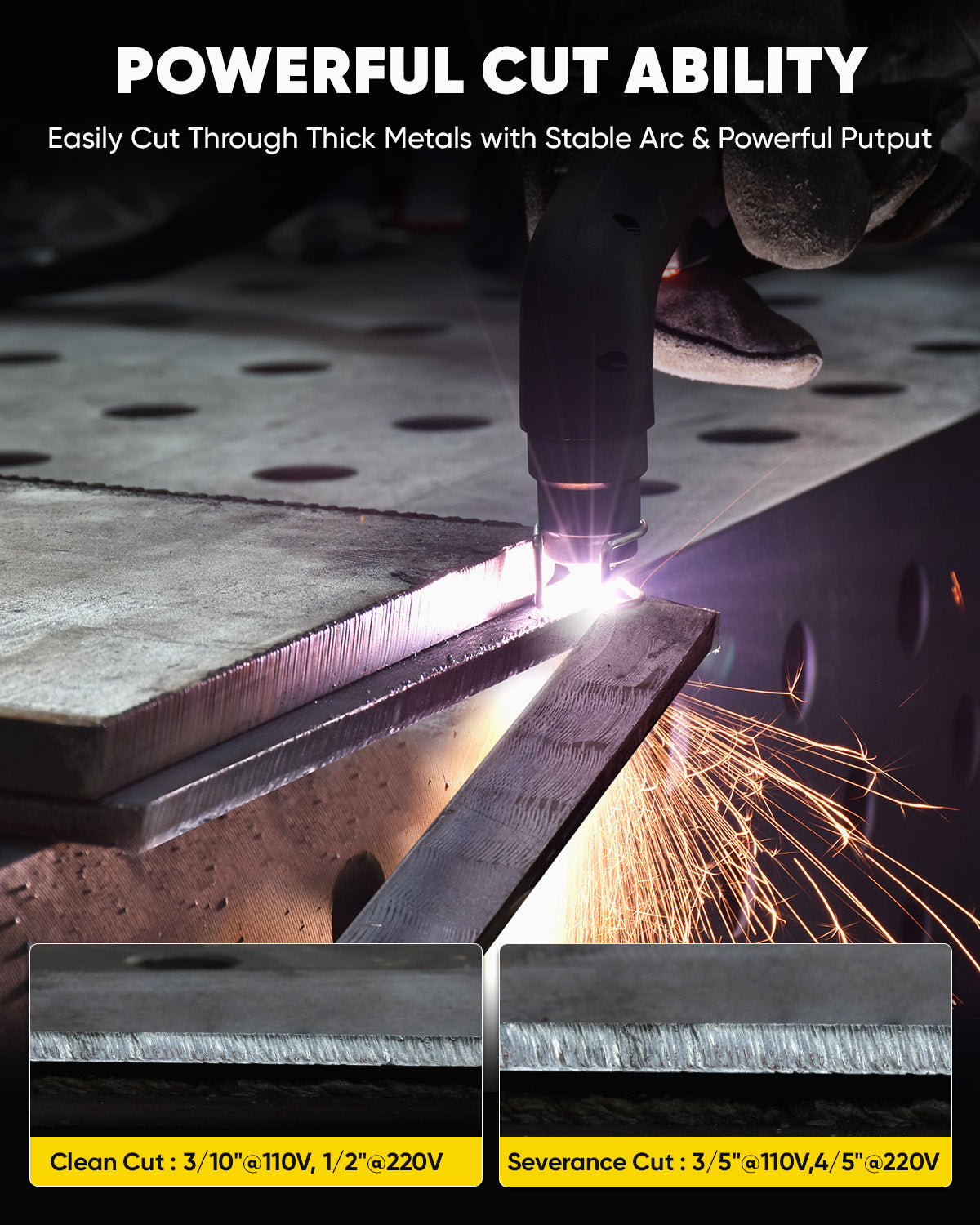 Enhanced Cutting Power: Delivers a 55A maximum output, capable of a high-quality clean cut on 8mm steel at 40 PSI and a maximum severance thickness of 15mm at 60 PSI.