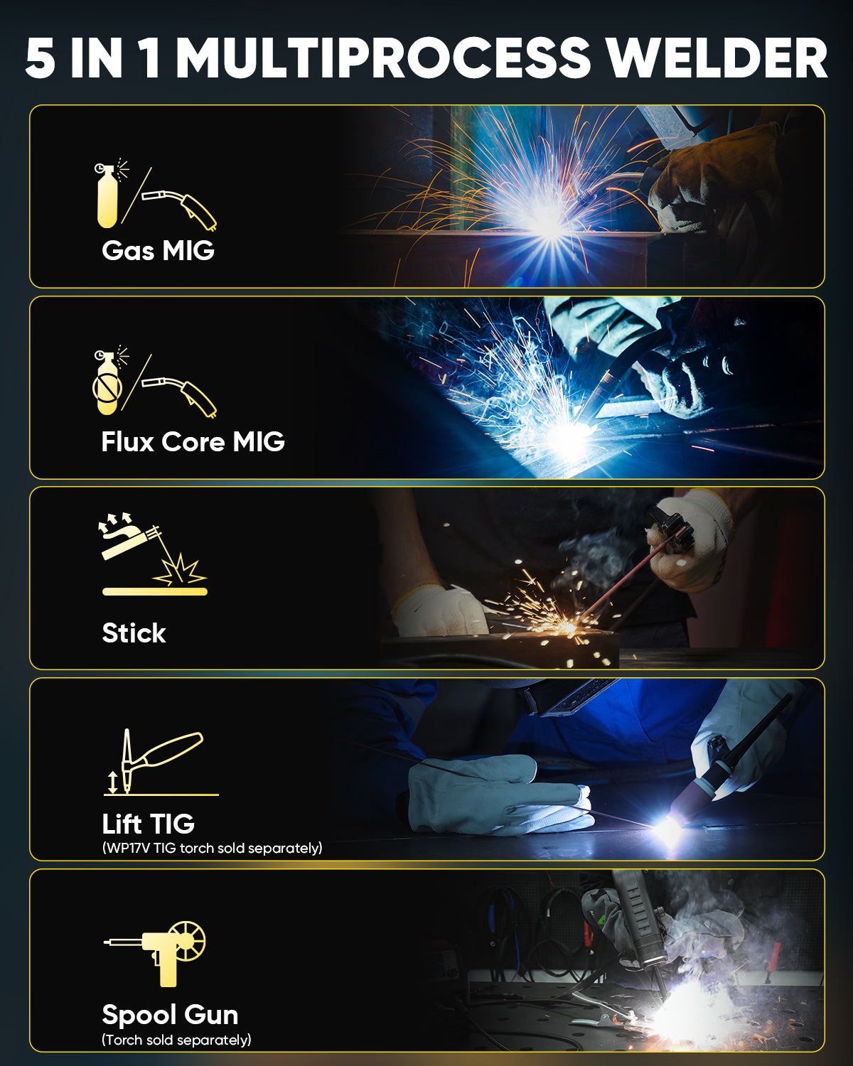 5-in-1 Multiprocess Functionality: Supports Gas-shielded MIG, Gasless Flux Core MIG, Manual Metal Arc (Stick), Lift TIG (WP17V torch sold separately), and Spool Gun connection for optimized aluminum welding.
