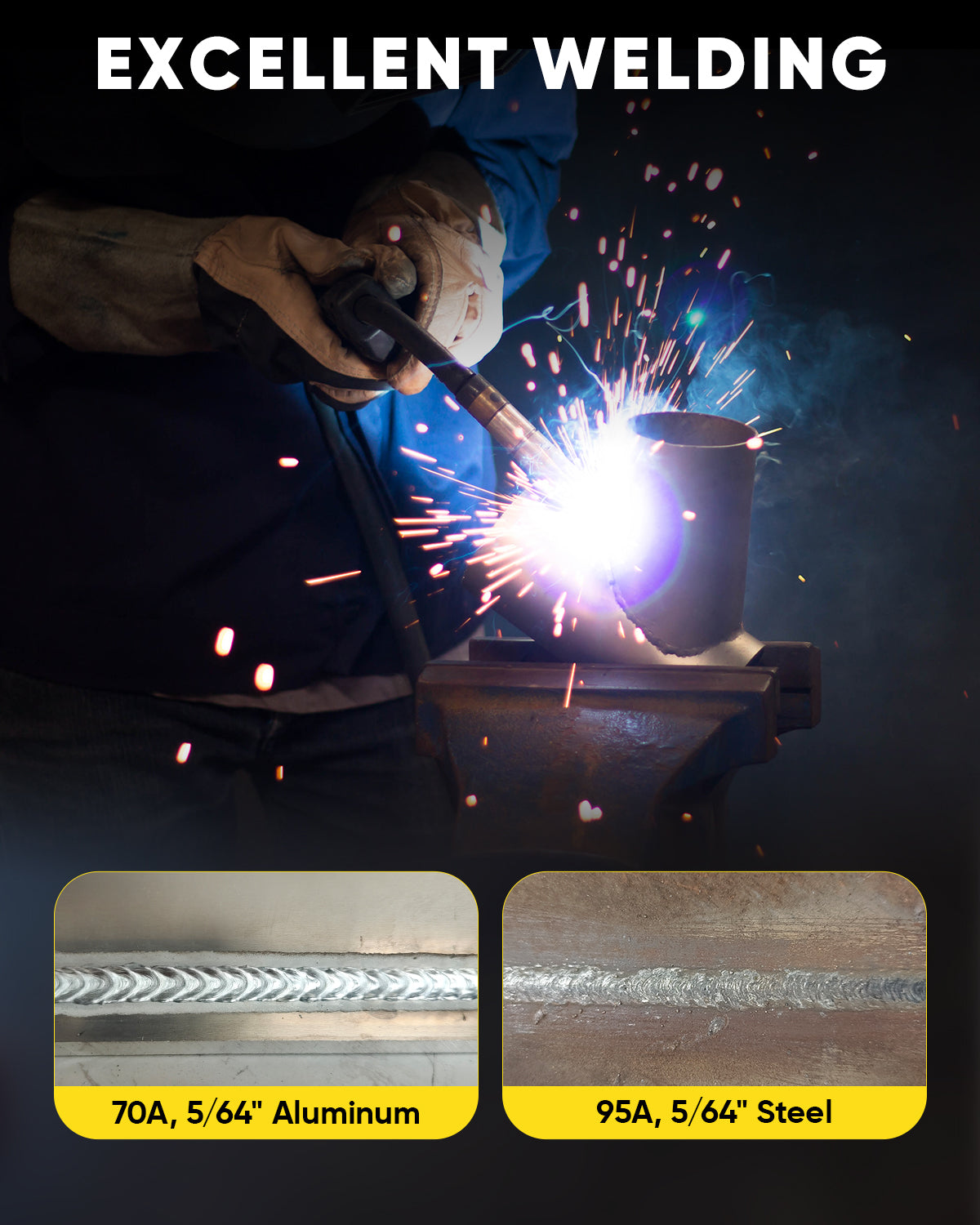 Aluminum Welding Optimized: Specifically designed to handle aluminum welding challenges. Achieve high-quality beads on 5/64" aluminum at 70A and 5/64" steel at 95A.